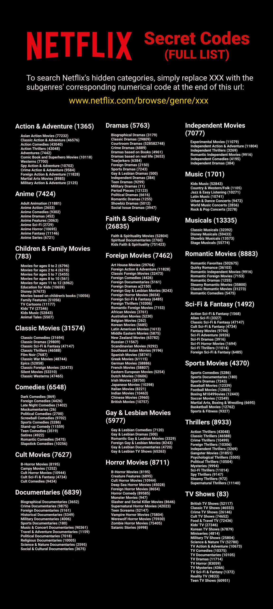 To search Netflix’s hidden categories, simply replace XXX with the subgenres’ corresponding numerical code at the end of this url: www.netflix.com/browse/genre/XXX