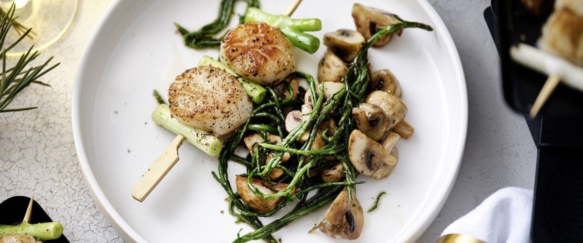 - Rijg telkens 2 coquilles aan een spiesje, afgewisseld met een stukje lente-ui.